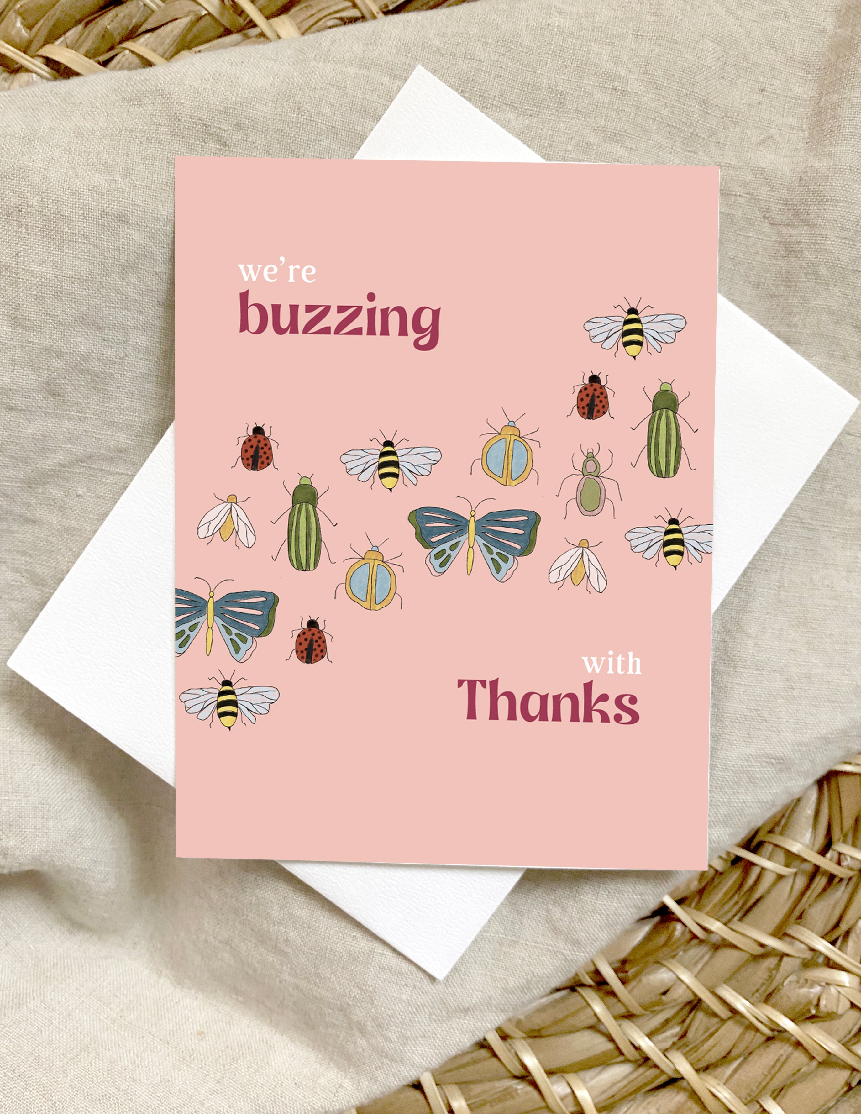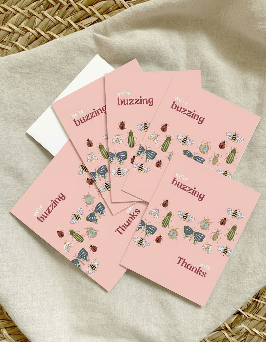 This bug pun thank you card pack is great to have on hand to say thanks. They are blank on the inside so you can customize to what ever the need is! Great for a baby shower thank you cards or wedding showers. Or really any occasion a thank you is in order to tell you loved ones how much they mean to you. This illustration was done by hand in house at Tupos Studio and we are so happy to get to share it with you. This pack includes 5 greeting cards with dimensions of 4.5" x 5.5". Each card comes with a corresponding white Felt Weave- A2 envelope (5.75 x 4.375") Printed on 100% recycled #80 cover stock paper.